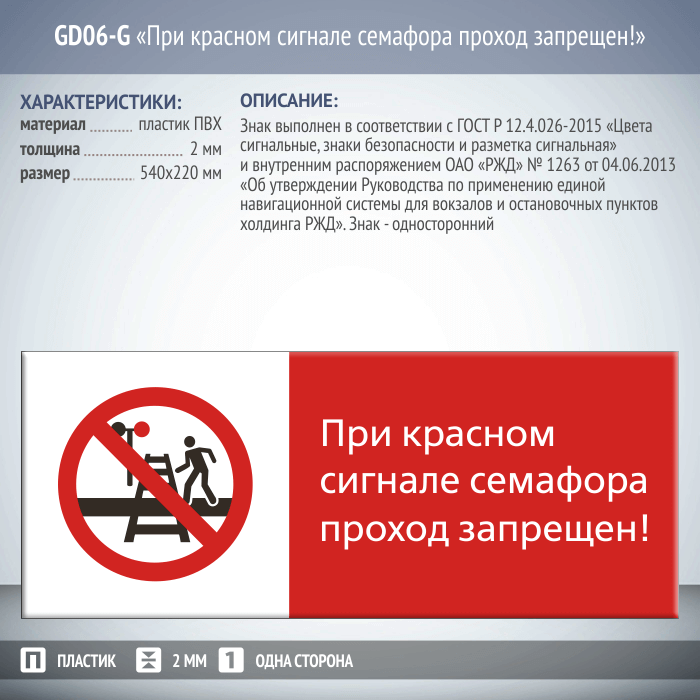 Знак «При красном сигнале семафора проход запрещен!», GD06-G (односторонний горизонтальный, 540х220 мм, пластик 2 мм) в Улан-Удэ купить