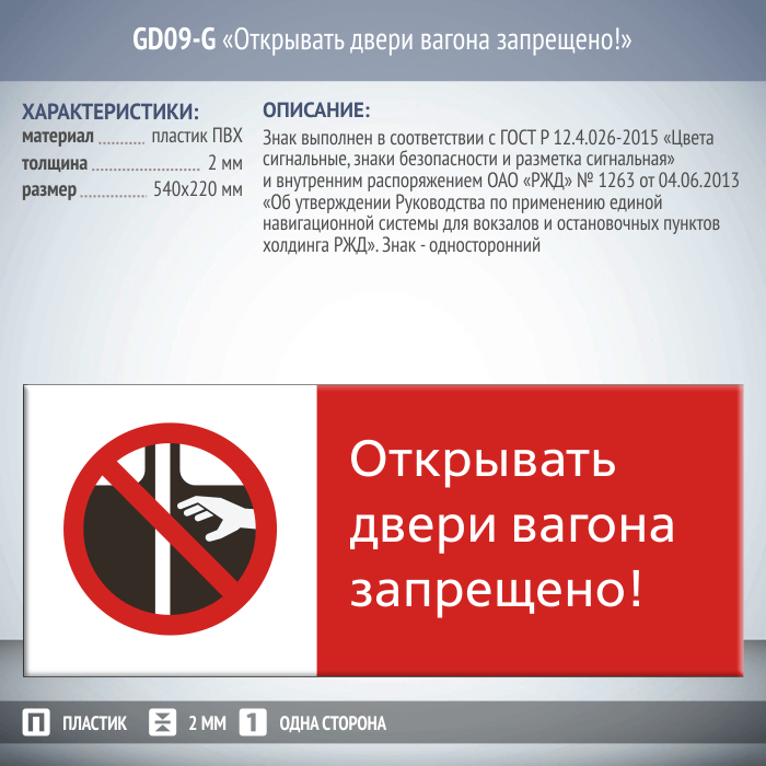 Знак «Открывать двери вагона запрещено!», GD09-G (односторонний горизонтальный, 540х220 мм, пластик 2 мм) в Улан-Удэ купить