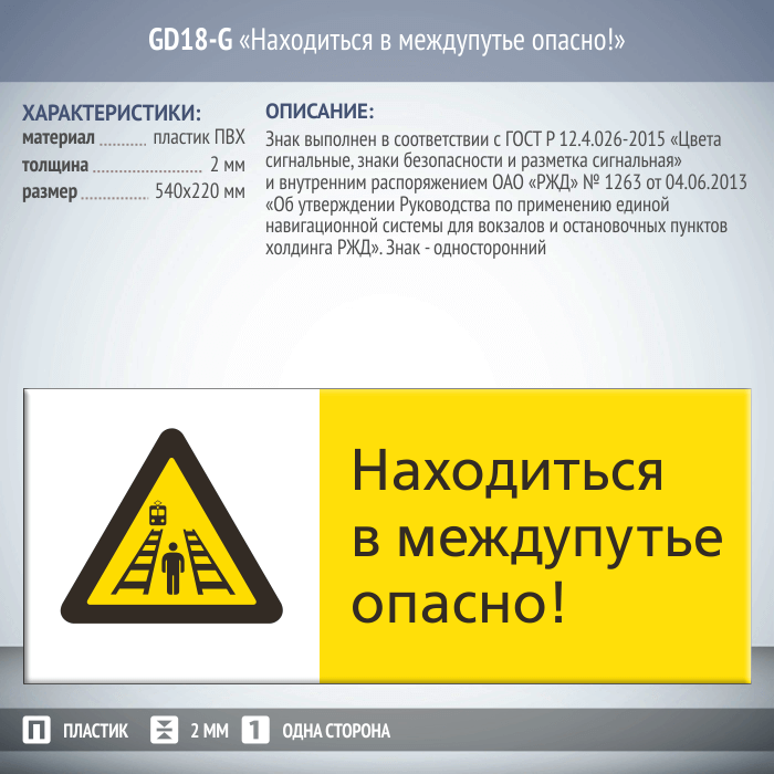 Знак «Находиться в междупутье опасно!», GD18-G (односторонний горизонтальный, 540х220 мм, пластик 2 мм) в Улан-Удэ купить