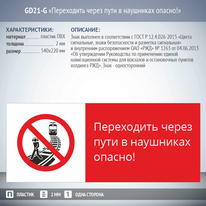 Знак «Переходить через пути в наушниках опасно!», GD21-G (односторонний горизонтальный, 540х220 мм, пластик 2 мм) в Улан-Удэ купить