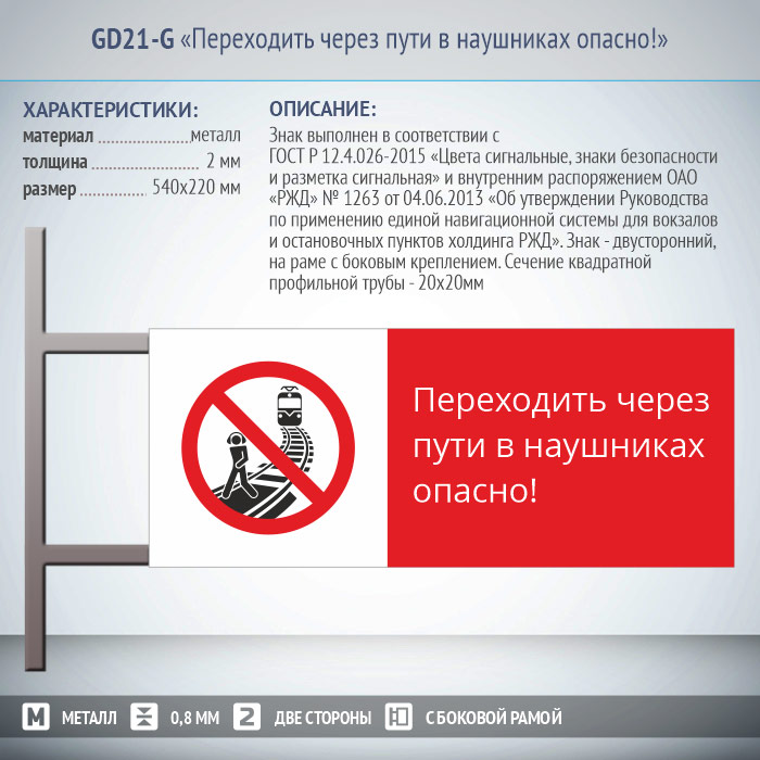 Знак «Переходить через пути в наушниках опасно!», GD21-G (двусторонний горизонтальный, 540х220 мм, металл, на раме с боковым креплением) в Улан-Удэ купить