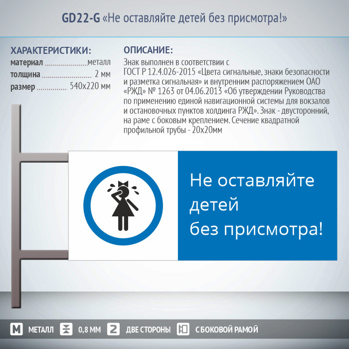 Знак «Не оставляйте детей без присмотра!», GD22-G (двусторонний горизонтальный, 540х220 мм, металл, на раме с боковым креплением) в Улан-Удэ купить