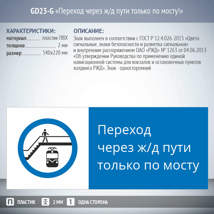 Знак «Переход через ж/д пути только по мосту!», GD23-G (односторонний горизонтальный, 540х220 мм, пластик 2 мм) в Улан-Удэ купить