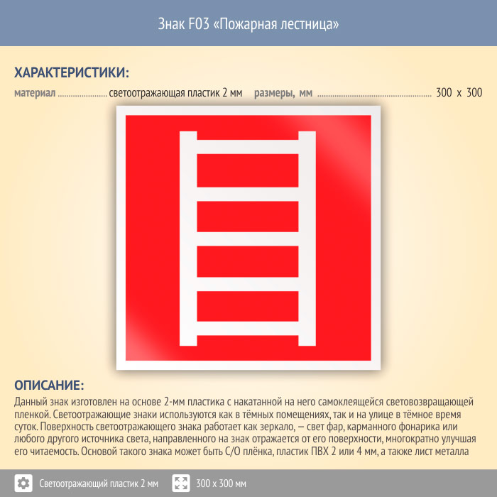Знак F03 «Пожарная лестница» (светоотражающий пластик, 300х300 мм) в Улан-Удэ купить