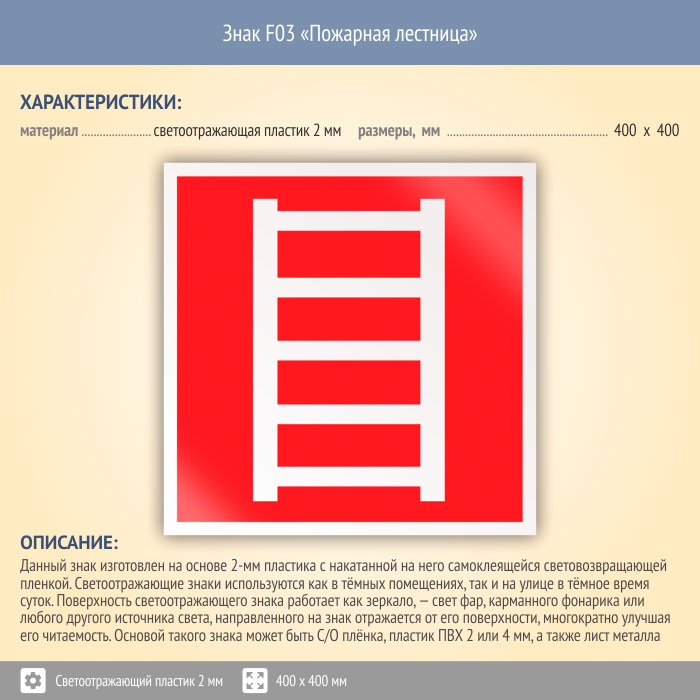 Знак F03 «Пожарная лестница» (светоотражающий пластик, 400х400 мм) в Улан-Удэ купить