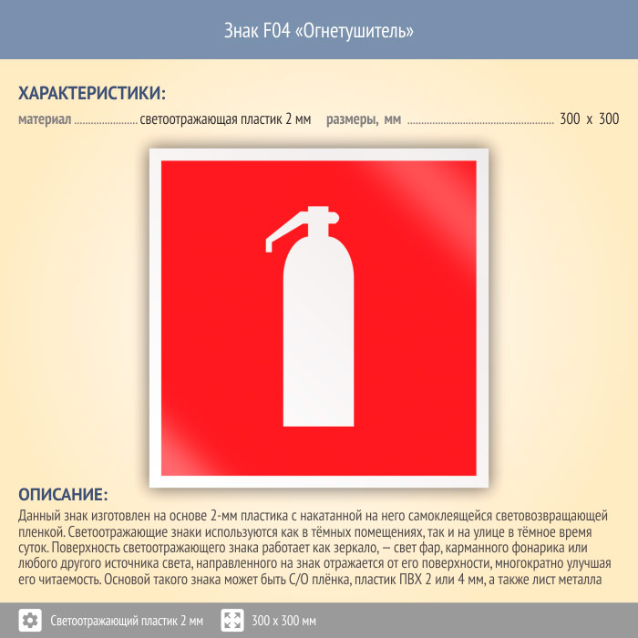 Знак F04 «Огнетушитель» (светоотражающий пластик, 300х300 мм) в Улан-Удэ купить