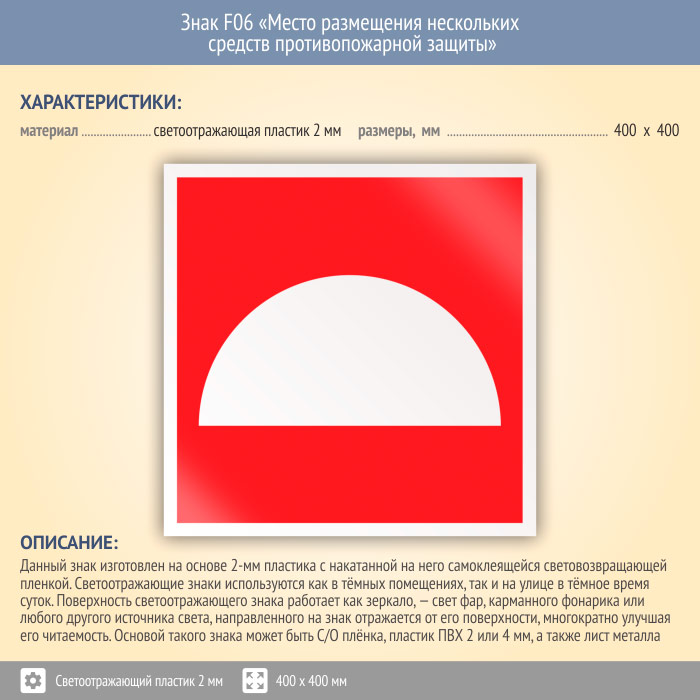 Знак F06 «Место размещения нескольких средств противопожарной защиты» (светоотражающий пластик, 400х400 мм) в Улан-Удэ купить