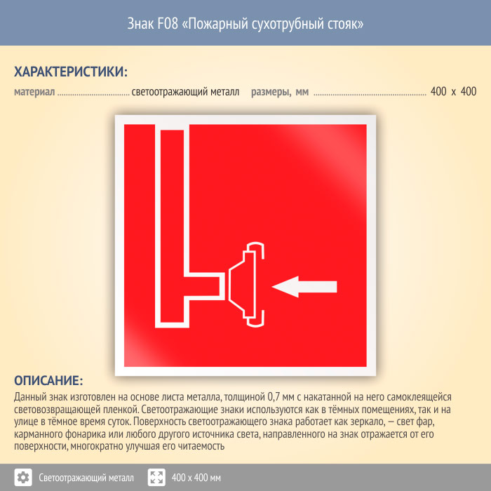 Знак F08 «Пожарный сухотрубный стояк» (светоотражающий металл, 400х400 мм) в Улан-Удэ купить