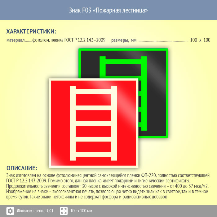 Знак F03 «Пожарная лестница» (фотолюминесцентная пленка ГОСТ 34428-2018, 100х100 мм) в Улан-Удэ купить
