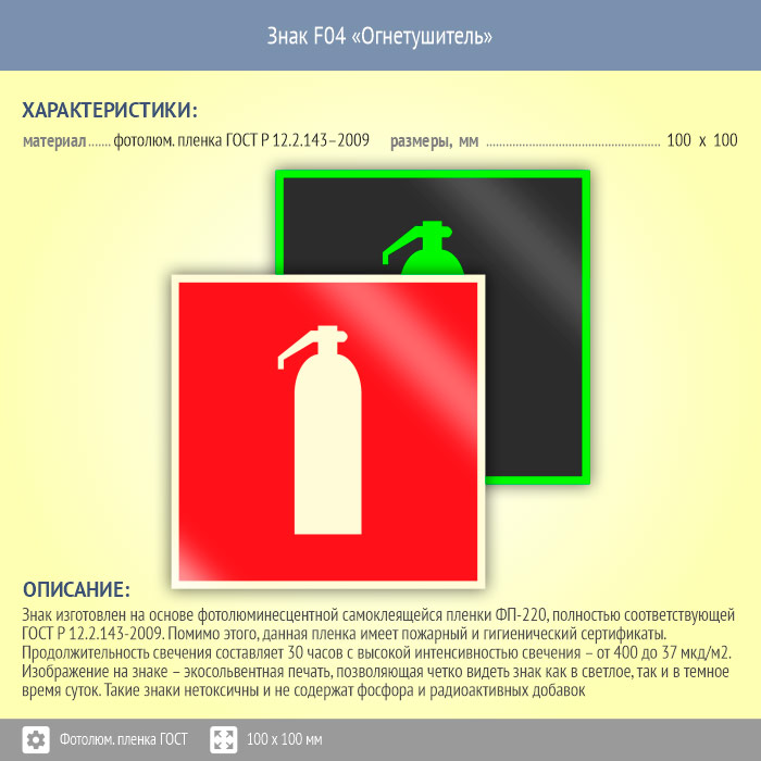 Знак F04 «Огнетушитель» (фотолюминесцентная пленка ГОСТ 34428-2018, 100х100 мм) в Улан-Удэ купить