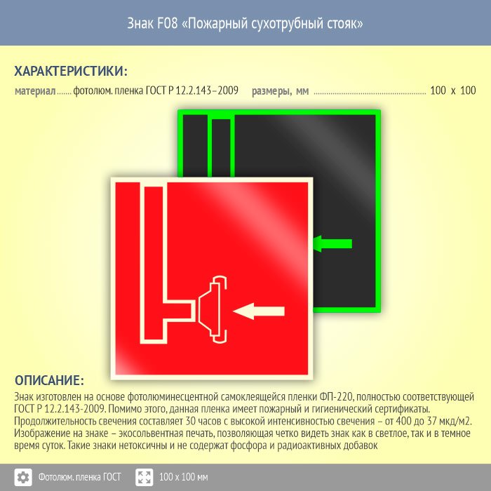 Знак F08 «Пожарный сухотрубный стояк» (фотолюминесцентная пленка ГОСТ 34428-2018, 100х100 мм) в Улан-Удэ купить