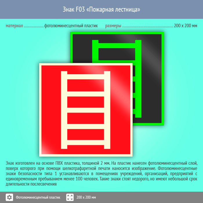 Знак F03 «Пожарная лестница» (фотолюминесцентный пластик, 200х200 мм) в Улан-Удэ купить