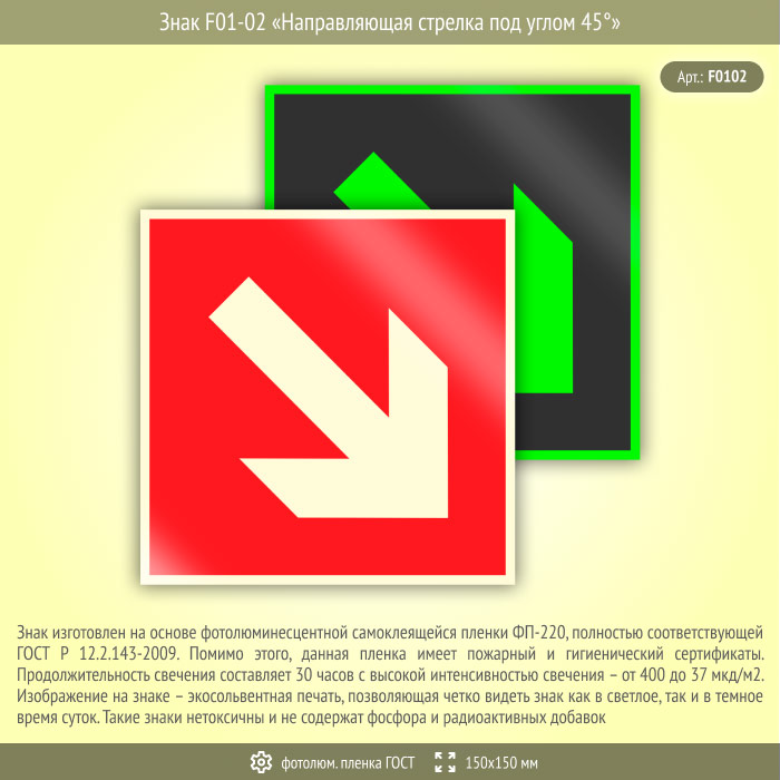 Знак F01-02 «Направляющая стрелка под углом 45°» (фотолюминесцентная пленка ГОСТ 34428-2018, 150х150 мм) в Улан-Удэ купить