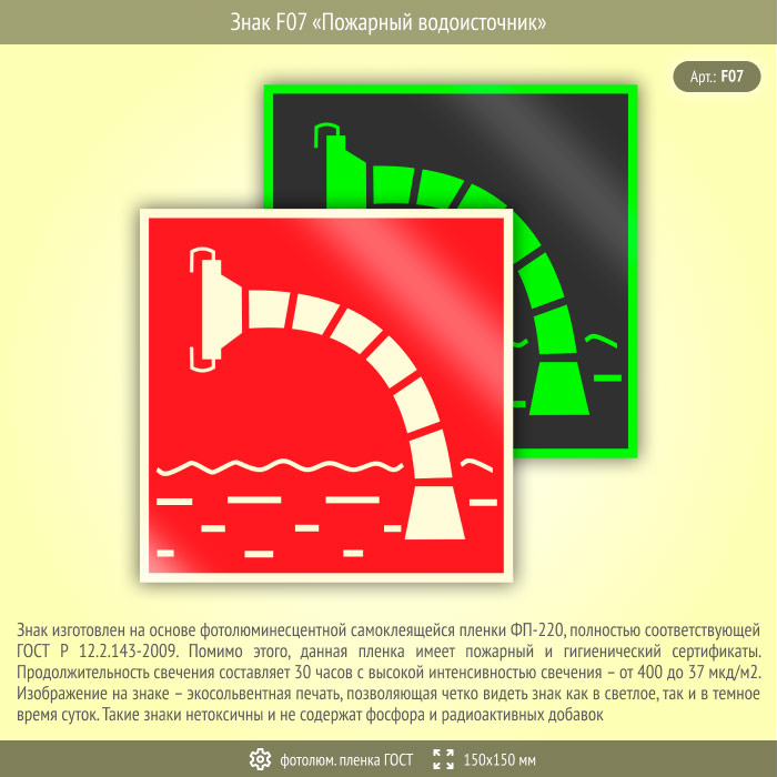 Знак F07 «Пожарный водоисточник» (фотолюминесцентная пленка ГОСТ 34428-2018, 150х150 мм) в Улан-Удэ купить