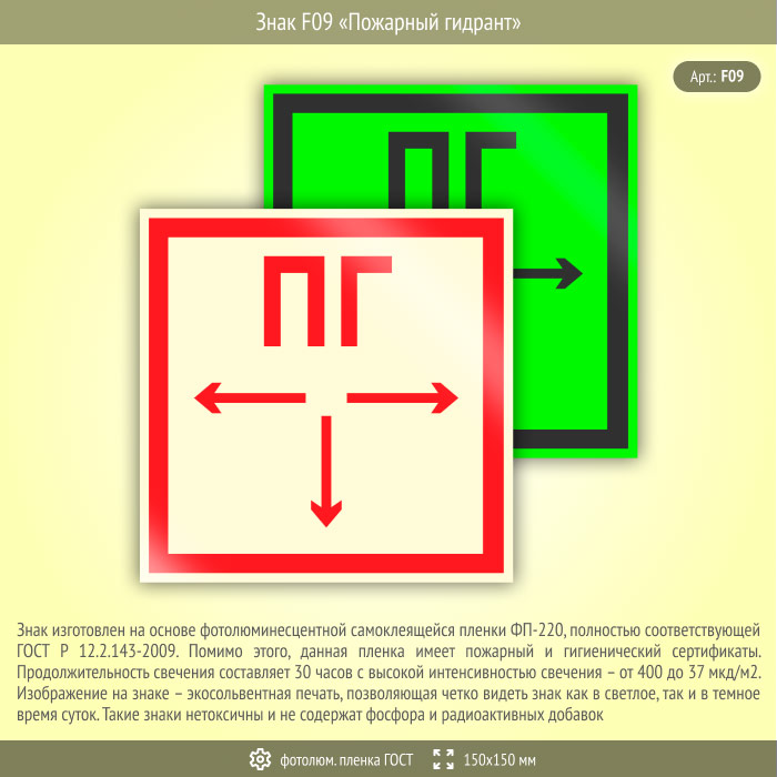 Знак F09 «Пожарный гидрант» (фотолюминесцентная пленка ГОСТ 34428-2018, 150х150 мм) в Улан-Удэ купить