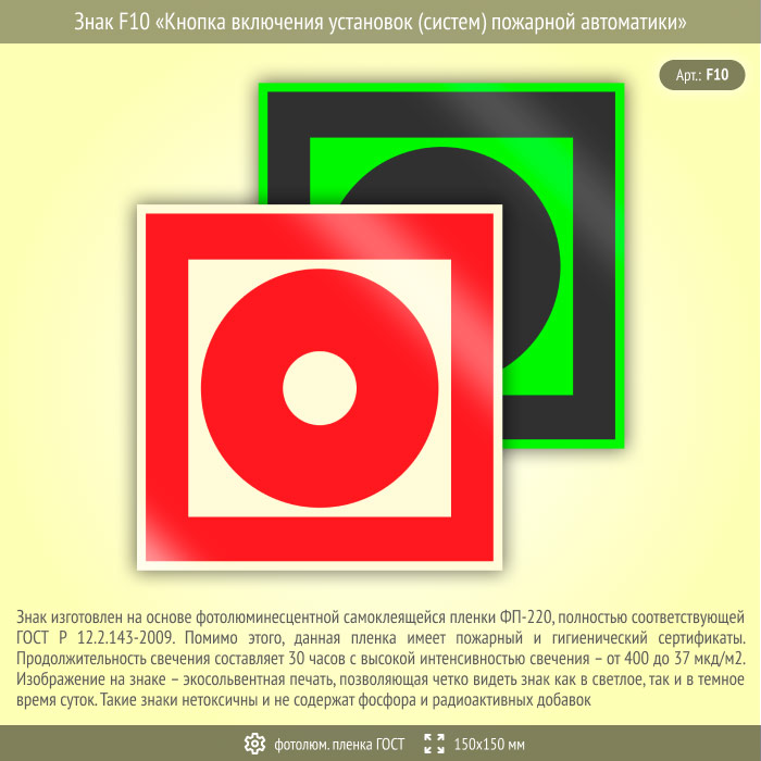 Знак F10 «Кнопка включения установок (систем) пожарной автоматики» (фотолюминесцентная пленка ГОСТ 34428-2018, 150х150 мм) в Улан-Удэ купить