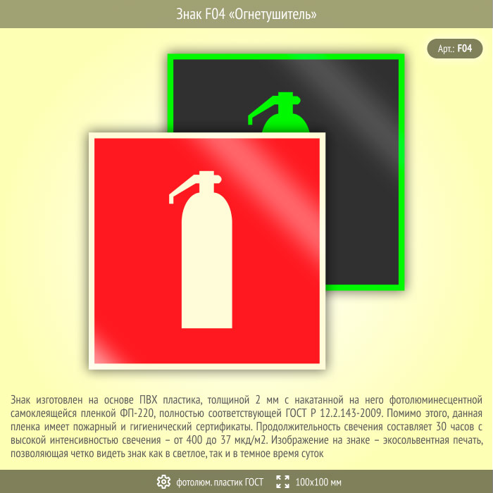 Знак F04 «Огнетушитель» (фотолюминесцентный пластик ГОСТ 34428-2018, 100х100 мм) в Улан-Удэ купить