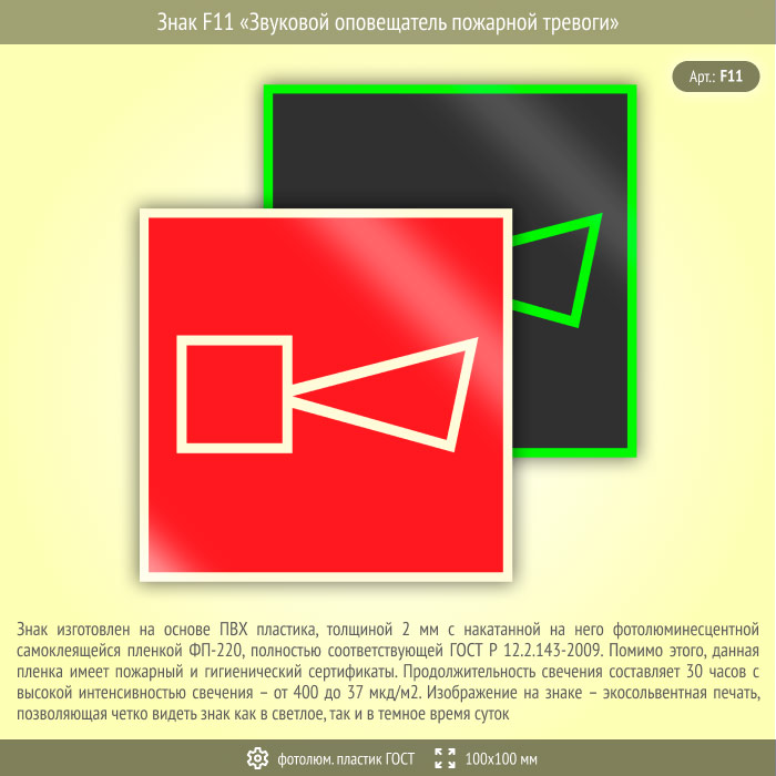 Знак F11 «Звуковой оповещатель пожарной тревоги» (фотолюминесцентный пластик ГОСТ 34428-2018, 100х100 мм) в Улан-Удэ купить