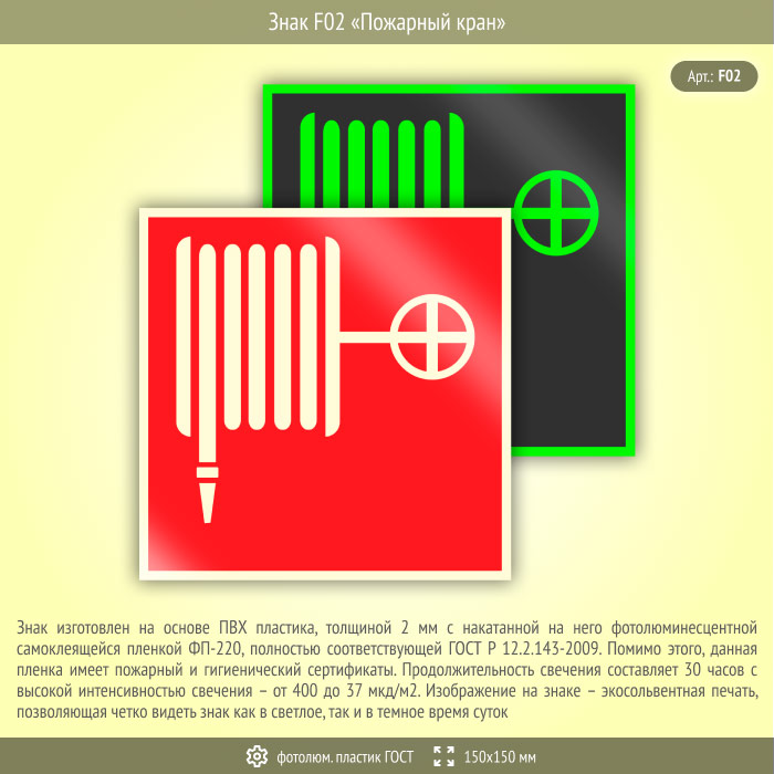 Знак F02 «Пожарный кран» (фотолюминесцентный пластик ГОСТ 34428-2018, 150х150 мм) в Улан-Удэ купить