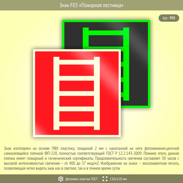 Знак F03 «Пожарная лестница» (фотолюминесцентный пластик ГОСТ 34428-2018, 150х150 мм) в Улан-Удэ купить