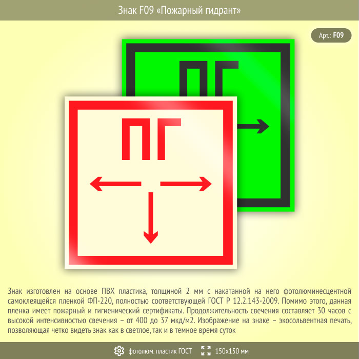 Знак F09 «Пожарный гидрант» (фотолюминесцентный пластик ГОСТ 34428-2018, 150х150 мм) в Улан-Удэ купить