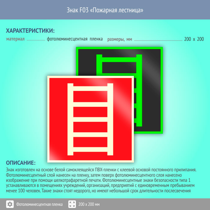 Знак F03 «Пожарная лестница» (фотолюминесцентная пленка, 200х200 мм) в Улан-Удэ купить