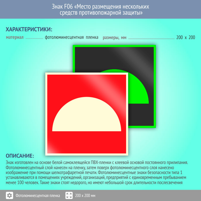 Знак F06 «Место размещения нескольких средств противопожарной защиты» (фотолюминесцентная пленка, 200х200 мм) в Улан-Удэ купить