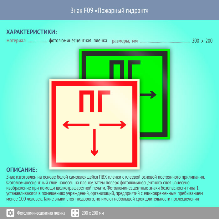 Знак F09 «Пожарный гидрант» (фотолюминесцентная пленка, 200х200 мм) в Улан-Удэ купить
