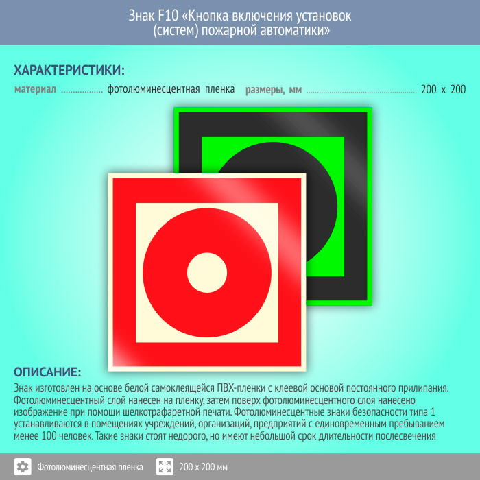 Знак F10 «Кнопка включения установок (систем) пожарной автоматики» (фотолюминесцентная пленка, 200х200 мм) в Улан-Удэ купить