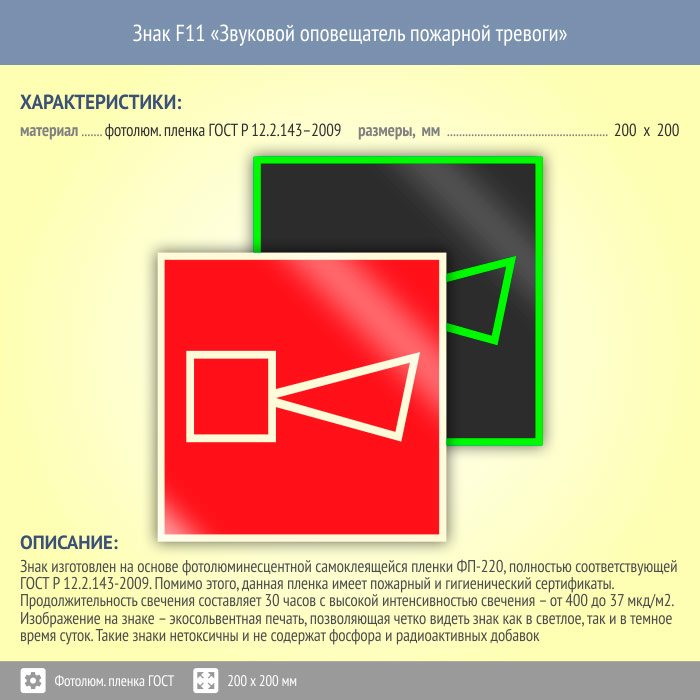 Знак F11 «Звуковой оповещатель пожарной тревоги» (фотолюминесцентная пленка ГОСТ 34428-2018, 200х200 мм) в Улан-Удэ купить
