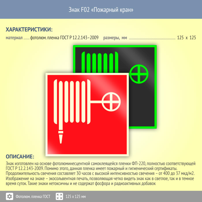 Знак F02 «Пожарный кран» (фотолюминесцентная пленка ГОСТ 34428-2018, 125х125 мм) в Улан-Удэ купить