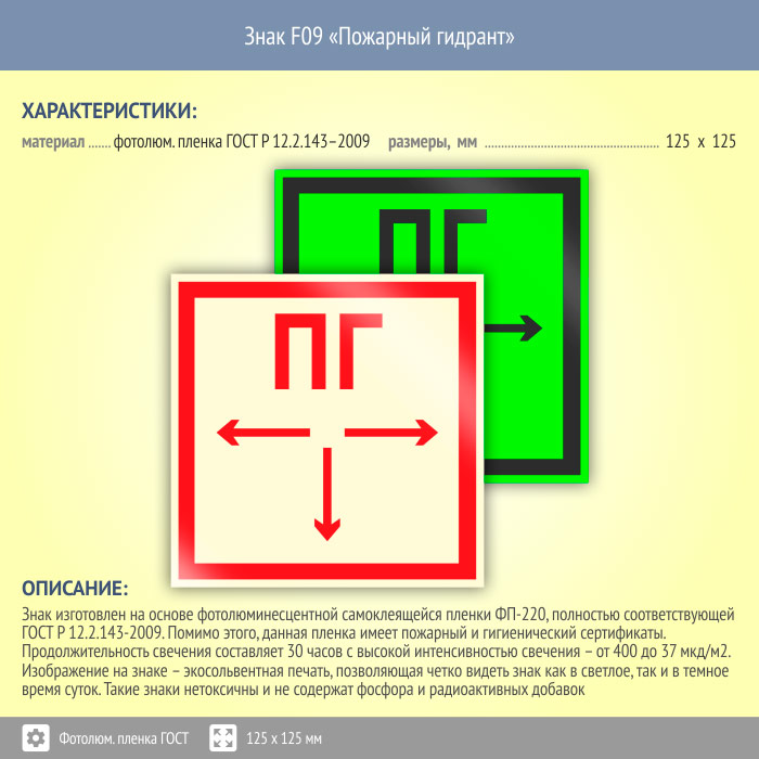Знак F09 «Пожарный гидрант» (фотолюминесцентная пленка ГОСТ 34428-2018, 125х125 мм) в Улан-Удэ купить