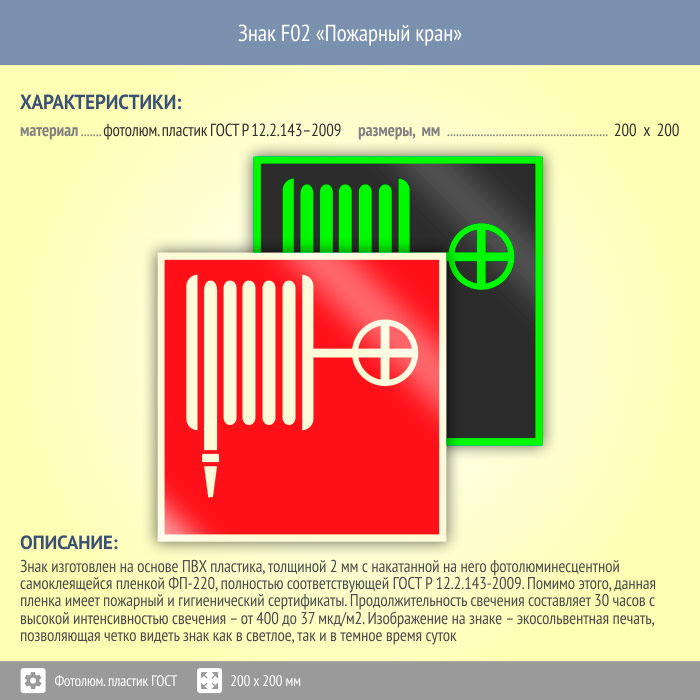 Знак F02 «Пожарный кран» (фотолюминесцентный пластик ГОСТ 34428-2018, 200х200 мм) в Улан-Удэ купить