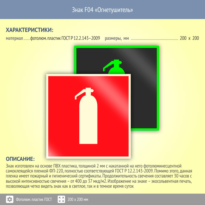 Знак F04 «Огнетушитель» (фотолюминесцентный пластик ГОСТ 34428-2018, 200х200 мм) в Улан-Удэ купить