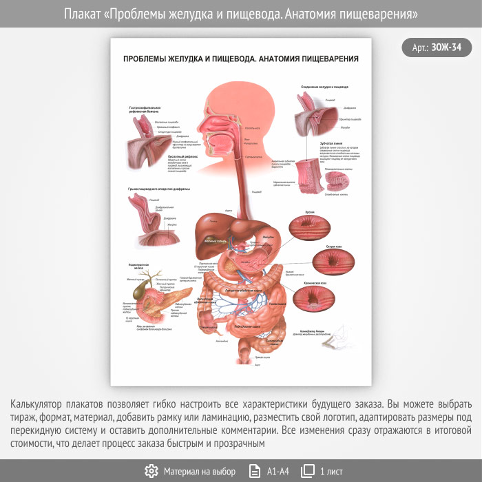 Плакат «Проблемы желудка и пищевода. Анатомия пищеварения» (ЗОЖ-34, 1 лист) в Улан-Удэ купить
